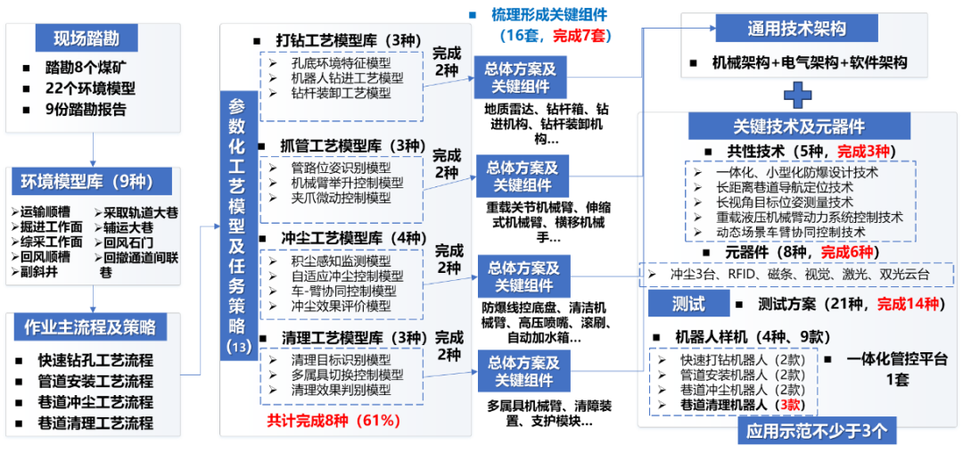 5月19日,由中煤科工机器人科技有限公司牵头的国家重点研发计划“智能机器人” 重点专项“大型煤矿井下巷道辅助作业机器人关键技术与应用示范”项目中期检查会议在辽宁省沈抚改革创新示范区召开。本次会议由中煤科工机器人科技有限公司主办,中国科学院沈阳自动化研究所协办。会议邀请了哈尔滨工业大学赵杰教授、西北工业大学程晖教授、中国煤炭学会申宝宏研究员、山西焦煤集团有限责任公司杨彦群研究员、中国北方车辆研究所江磊教授、中国科学院自动化研究所王硕研究员、重庆凯瑞机器人技术有限公司李本旺研究员等技术评审专家以及2位财务专家对项目的进展情况进行了了解和审议,项目组30余位技术骨干参加了会议。本次会议旨在全面评估项目进展,确保关键技术突破、成果示范应用和项目总体的顺利推进。会议开始首先由中煤科工机器人科技有限公司执行董事、总经理陈杰致辞,他指出,煤矿机器人的应用是煤矿智能化发展的重要方向之一,发挥着至关重要的作用。本项目是在国家科技部、工信部、矿山局的大力支持下,立项的智能机器人重点专项,由机器人公司牵头承担,体现了国家对煤矿机器人的重视,也体现了国家对中国煤炭科工集团科研实力的高度信任。项目组充分调用集团支持力量和资源,推动研发工作的顺利进行。按照会议日程安排,在项目进展汇报中,首先由项目负责人机器人公司副总经理王雷做项目中期总体汇报。王雷表示,项目总体踏勘8个煤矿,具体踏勘22个煤矿场景,梳理形成9个环境模型库;构建了包含硬件层、系统层、核心应用层、远端服务层等8层辅助作业机器人技术架构,指导机器人产品开发;规范了煤矿辅助作业机器人设计开发流程,实现了面向环境约束和工艺任务特征约束下的产品正向设计开发;针对煤机和机器人结合特点,项目指导形成了各个课题主任务流程及任务策略,牵头梳理形成项目13个工艺模型及任务策略并进行评审;完成了多种煤矿辅助作业机器人组部件及元器件研制。随后,项目所属各课题组组长分别做课题中期汇报。从汇报中可以看出,取得的重要成果有:课题一完成了打钻机器人孔底多参数测量装备、钻进系统方案等考核指标;课题二完成了管道安装机器人防爆液压机械臂样机、管道识别算法软件等考核指标;课题三完成了巷道冲尘机器人运载平台、积尘传感器样机、冲尘机构等考核指标;课题四完成了巷道清理机器人目标识别传感器样机、作业机械臂样机、快换装置及整机系统设计等考核指标;课题五完成了2种煤矿机器人用传感器样机研制、形成导航软件及混合通信软件,同时课题五为课题一、二、三、四在导航、视觉识别、机械臂运控、巷道三维建模技术等方面提供了支持。总体来看,各课题进展情况均达到中期考核要求。下午,项目组组织开展了现场检查。在机器人公司副总经理王雷的陪同下,专家组前往机器人公司的生产研发基地参观及现场检查,王雷副总经理向专家组详细介绍了公司的研发历程、技术实力和产品特点。他表示,公司一直致力于机器人技术的研发和应用,已在煤矿及非煤领域取得了显著的应用效果。同时,通过现场实地检查和视频连线的方式,专家组对项目当前完成的实物样机进行了考核,并对项目搭建的打钻、抓管、冲尘等模拟测试场景表示肯定,并建议在具体指标测试环节再进行细化,加快对现场实施方案的进一步论证和评审。汇报及现场检查完成后,专家组就项目及课题的执行进展、阶段性成果等情况进行了质询与讨论,对项目取得的成果给予了充分肯定。同时,专家组对项目整体成果产出、示范应用等方面提出了建议,希望通过项目的攻关,提升矿山机器人的技术水平及现场实用性。经过充分研讨,最后专家组一致同意项目通过中期检查。会后,项目组及时组织各课题负责人召开了项目内部会议,将专家组提出的意见和建议形成会议纪要,逐条讨论并形成实施计划,进一步明确了重点工作方向。项目组下一步将按照专家意见加快研究进展,细化各项任务时间节点,将成果做实、示范应用做好,保障项目的顺利实施。同时,项目组也将严格按照IPD 管理模式,加强过程监管,保证项目进度;不断完善梳理新型煤矿机器人研发的共性架构及关键技术,不断优化迭代使工程作业装备机器人化的工艺流程和控制策略;不断完善测试体系建设,加强标准体系建设;进一步凝练科学问题和关键卡脖子技术,促进煤矿机器人行业的底层技术高质量发展。“大型煤矿井下巷道辅助作业机器人关键技术与应用示范”作为煤矿机器人领域的国家重点研发计划项目,首次规范了统一的技术架构及开发流程,定义了统一的接口规范,植入机器人思维,挖掘了各个课题的核心难点及关键技术,通过组织核心点正向设计评审,降低课题实施风险,创新提出了防爆及受限空间约束下辅助作业机器人设计、井下作业目标多要素信息高精度测量等理论和方法,攻克了自适应钻进、管路识别、重载机械臂控制等关键技术,为井下作业型机器人理论、技术及装备体系进步提供重要支撑。此次会议不仅是对机器人公司牵头的国家重点研发计划“智能机器人” 重点专项“大型煤矿井下巷道辅助作业机器人关键技术与应用示范”项目在过去工作成果的阶段性总结与反思,更是对项目下一步实施计划的优