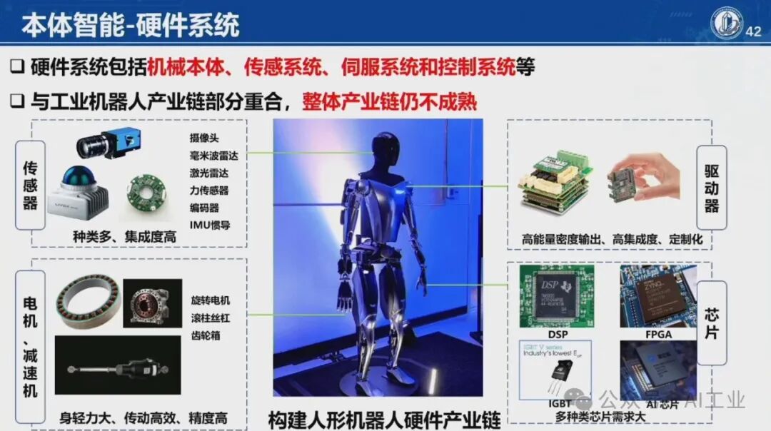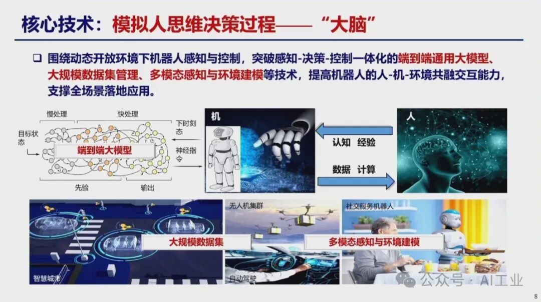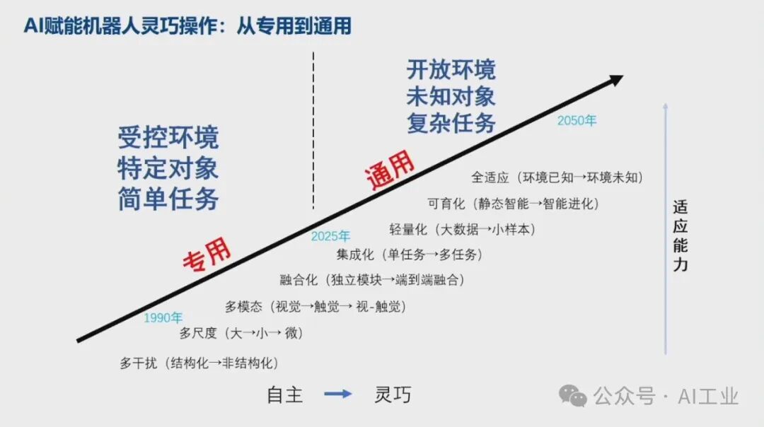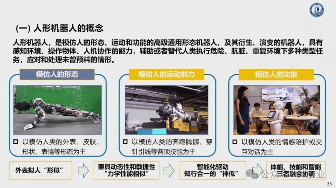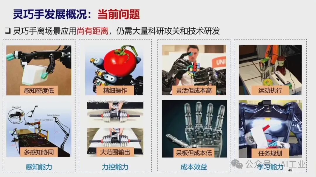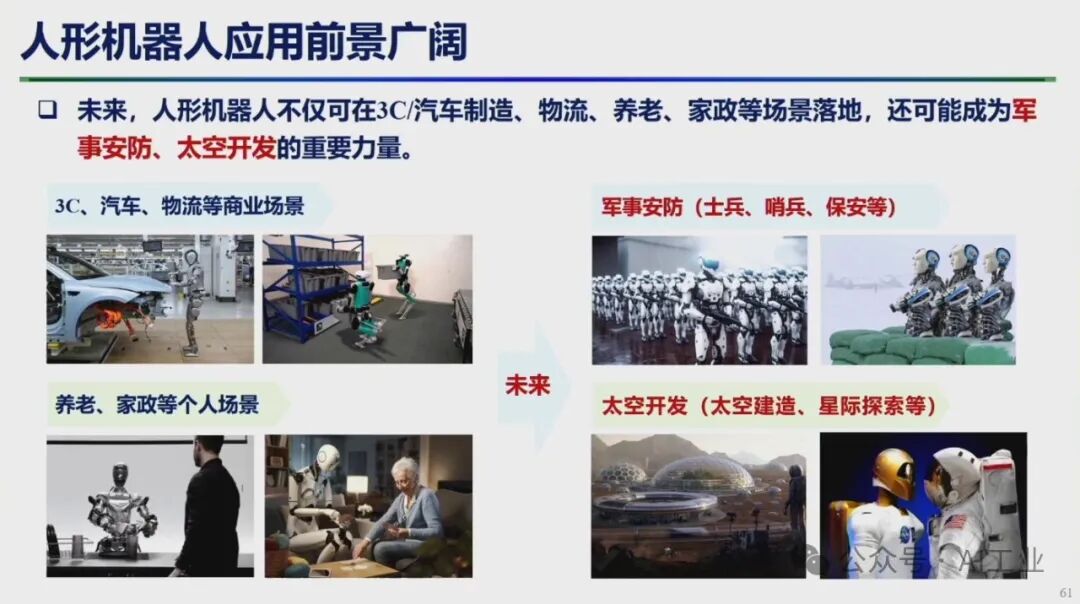4月9日,首届中国人形机器人产业大会暨具身智能峰会在海淀区开幕。中国科学院院士、华中科技大学学术委员会主任丁汉院士在会上发表了题为《机器人未来技术研判》的演讲。丁汉院士深入剖析了当前机器人技术的发展现状,并对未来趋势进行了科学预测。丁汉院士表示,人形机器人具有通用性好和柔性高等优点,适合低精度、低负载、高柔性、高协作、复杂多任务的场景,主要在军事应用、航空航天、工业制造和家庭服务等领域。目前人形机器人离场景应用尚有距离,但基于大量科研攻关和技术研发,未来将有理想的产业机遇。人形机器人智能技术程度由低到高分为本体智能、空间智能和通用智能。硬件系统包括机械本体、传感系统、伺服系统和控制系统等,整体产业链仍不成熟。人形机器人可持续高质量发展硬件水平至关重要。本体智能中核心技术-通用抓取,灵巧手结构设计、触觉传感抓取规划依赖于新结构、新材料、新算法的发展。模仿人达到敏捷快速、响应灵活、动作多样、适应顺形自如仍是长期而艰巨的任务。因此,灵巧手是人形机器人迈向通用化最核心的技术之一。在环境智能复杂空间通行,规划实时性和可靠性差,算法的瓶颈急需加强数学和物理等基础理论研究。人形机器人需要政府引导、企业探索、全产业链协同、高校研发投入、专业人才加大培养,形成政产学研用,贯穿研发、孵化、转化、投融资服务等关键链条,有效提升科技成果转移转化成效,推动人形机器人创新赋能经济高质量发展。