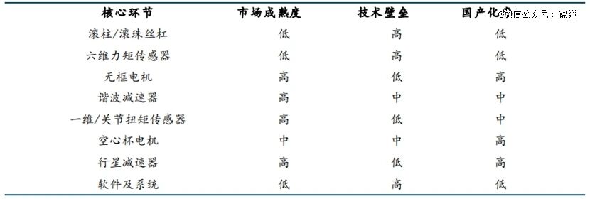 当前,滚柱/滚珠丝杠、力矩传感器为首的零部件市场成熟度低、壁垒高、国产化率低,价值量更大,孕育机会更多。