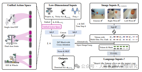 模型架构:RDT 基于扩散模型设计,采用可扩展的 Transformer 架构,能够高效处理多模态输入的异质性,捕捉机器人数据的非线性和高频特性。模型通过扩散模型的多模态行为分布表示,展现出卓越的动作预测与执行能力。 统一动作空间:为解决数据稀缺问题,RDT 引入了物理可解释的统一动作空间,统一不同机器人的动作表示,同时保留原始动作的物理意义。这种设计极大地提升了模型的跨平台知识迁移能力。 大规模预训练与微调:RDT 在目前最大的多机器人数据集上进行预训练,扩展到 1.2B 参数量,并在自建的多任务双臂数据集上进行微调。该数据集包含超过 6000+ 个任务实例,显著提升了模型的双臂操作能力。 泛化能力与少样本学习:RDT 展现出强大的零样本泛化能力,能够处理未见过的物体和场景,仅通过 1~5 次演示即可学习新技能。在真实机器人实验中,RDT 明显优于现有方法,能够理解和遵循语言指令,有效处理复杂任务。 应用场景:RDT 在多种复杂任务中表现出色,例如调酒、遛狗、倒水、清洗杯子等。这些任务展示了 RDT 的灵巧操作能力、指令遵循能力和对未知环境的适应性