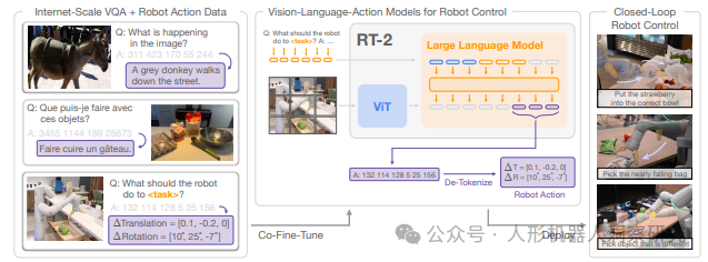 模型架构:RT-2 基于视觉语言模型(VLM)的主干网络,如 PaLM-E 和 PaLI-X,通过将动作表示为文本标记(tokens),使其能够直接输出机器人动作。这种设计允许模型将视觉、语言和动作统一在一个框架内处理。 预训练与微调:RT-2 在互联网规模的视觉语言数据上进行预训练,然后在机器人轨迹数据上进行微调。这种方法不仅保留了大规模预训练带来的语义理解能力,还使模型能够适应具体的机器人任务。 泛化能力与涌现能力:RT-2 展示了显著的泛化能力,能够处理未见过的对象、背景和指令。此外,模型还表现出多种涌现能力,例如对新命令的解释能力、基于用户指令的推理能力(如选择最小或最大的物体),以及多阶段语义推理(如选择合适的工具或饮料)。 实时推理与部署:为了实现高效的实时控制,RT-2 可以部署在云端,机器人通过云服务请求控制指令,从而实现快速响应