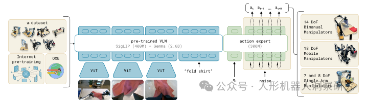 数据集:π₀ 使用了 OXE 数据集以及 Physical Intelligence 自行收集的机器人操作数据。 模型规模:π₀ 的基础模型 PaliGemma 拥有30亿参数,动作专家部分额外增加了3亿参数。 训练方法:π₀ 使用条件流匹配损失(Conditional Flow Matching)来监督动作的生成。