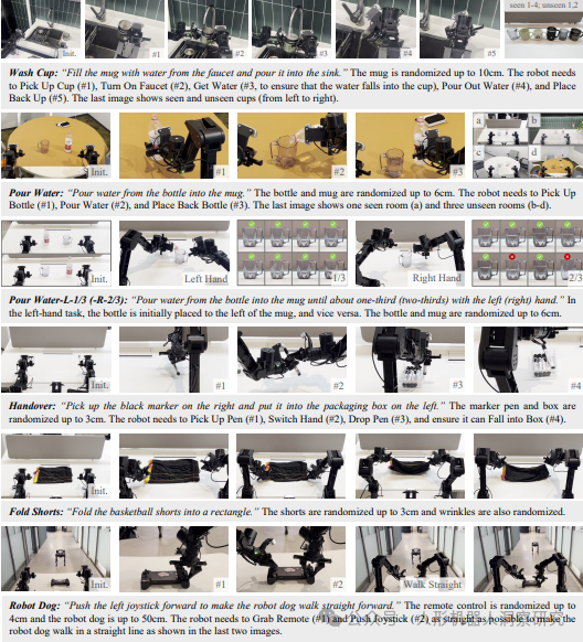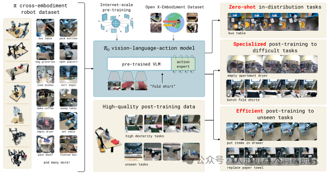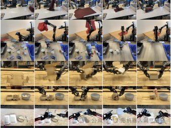 复杂操作任务:如叠衣服、清理餐桌、组装盒子。 实时控制:在动态环境中执行任务。 多机器人适配:通过微调适应不同的机器人平台