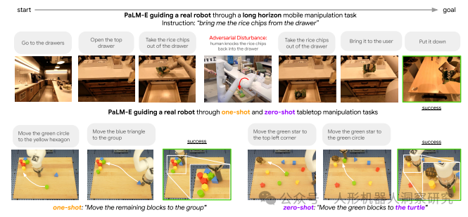 机器人任务规划:PaLM-E能够生成复杂的动作序列,完成导航、物体操作等任务。 视觉问答:通过图像输入,模型可以生成描述性文字或回答相关问题。 故障检测与长期规划:模型能够进行故障检测和长期任务规划,适应复杂环境