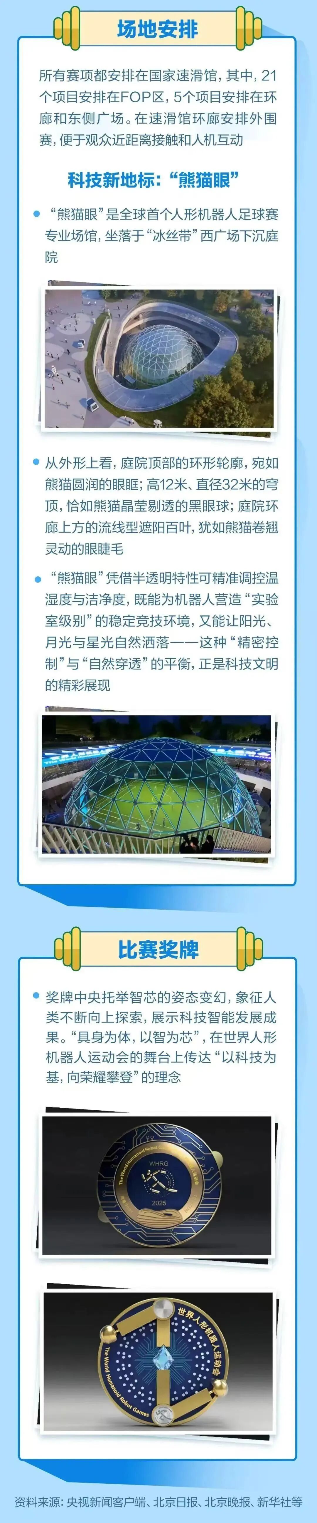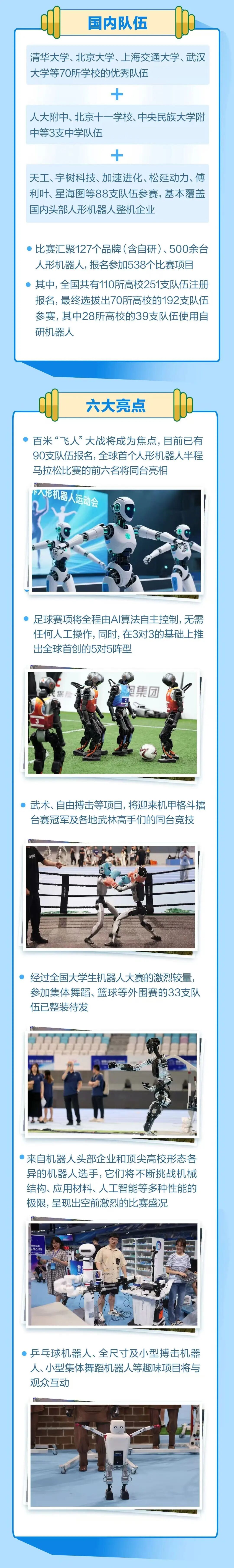 竞技赛中机器人将挑战人类传统体育项目,包括跑步、跳高、跳远、自由体操和3V3、5V5足球赛等。