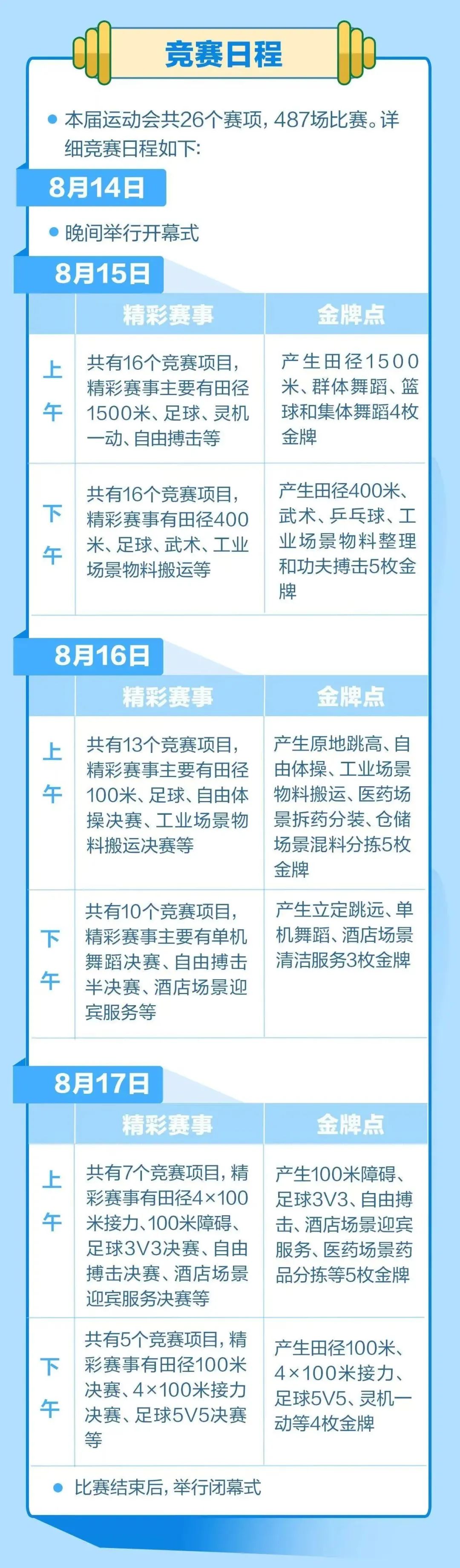 赛事于8月15日至17日火热开展,由主体赛事和外围赛事组成,共26个赛项、487场比赛、538个比赛项目的竞技对决。
