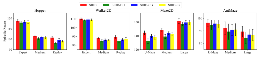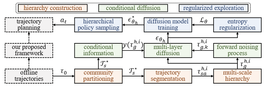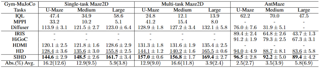 基于扩散模型(Diffusion Model)的生成方法已显示出用于从离线强化学习 (offline Reinforcement Learning) 数据集建模轨迹的巨大潜力,并且已引入分层扩散(Hierarchical Diffusion)来减轻长期规划任务中的方差累积和计算挑战。然而,现有方法通常假设具有单个预定义时间尺度的固定两层扩散层次结构,这限制了对各种下游任务的适应性并降低了决策的灵活性。 本文介绍一篇研究论文 《Structural Information-based Hierarchical Diffusion for Offline Reinforcement Learning》。该研究提出了一个名为 SIHD 的新型框架,该框架通过分析离线轨迹中内嵌的“结构信息”,自适应地构建一个多尺度的扩散层级,从而在具有稀疏奖励的长时序环境中实现高效、稳定的离线策略学习。 论文标题: Structural Information-based Hierarchical Diffusion for Offline Reinforcement Learning arxiv地址:https://arxiv.org/abs/2509.21942 代码地址:https://github.com/SELGroup/SIHD 离线强化学习旨在解决一个核心挑战:如何在不与环境进行新交互的情况下,仅利用固定的历史数据集训练出有效的策略。扩散模型通过将策略学习重构为条件轨迹生成任务,有效缓解了分布外(OOD)状态和动作导致的“外推误差”(extrapolation errors)问题 。 为了提升在长时序任务中的效率,分层策略被引入扩散模型,通过将复杂任务分解为由子目标引导的子问题来简化学习过程 。然而,当前主流方法存在两个关键局限: 固定的层级结构:通常假设一个由“子目标层”和“动作层”组成的刚性两层结构,缺乏对不同任务复杂度的适应性。 单一的时间尺度:采用预定义的固定时间步长来分割轨迹,无法捕捉现实世界任务中固有的多尺度时间模式。 这种单一时间尺度划分的固定分层方式阻碍了对不同时间模式和特定任务复杂性的适应性,从而限制了决策性能和灵活性。这提出了离线强化学习中的一个核心开放性挑战:如何系统地分析历史轨迹,以构建一个既可泛化又具有任务感知能力的扩散层级结构? 为应对上述挑战,SIHD 框架从三个方面进行了创新设计:层级构建、条件扩散和正则化探索。 图 1: 所提出的 SIHD 框架包括层次结构构建、条件扩散和正则化探索模块 1. 基于结构信息的多尺度扩散层级构建 SIHD 的核心在于其自适应的层级构建机制,它让数据自身的结构来决定层级的划分方式。 (1)构建状态拓扑图:首先,从离线数据集 中提取所有状态元素,并基于特征相似度(如余弦相似度)构建一个 k-近邻状态图 。 (2)挖掘社群结构 (Community Partitioning):接着,应用结构信息原理,通过一个名为 HCSE 的优化算法最小化 K-维结构熵 ,从而获得一个最优的树状编码结构 。这棵“编码树”的每一层都代表了在不同粒度上对状态空间的划分,形成了层次化的“状态社群”。 (3)自适应轨迹分割:基于 定义的社群结构,SIHD 能够为每一条历史轨迹 进行自适应的层级分割。在层级 , 会被分割成多段,确保每个片段内的状态都属于同一个社群。最终,每个片段的末端状态被定义为该层的子目标 。 这一过程使得 SIHD 能够从数据中自动推断出不同任务的动态时间尺度,构建出一个灵活的多尺度扩散层级。 2. 基于结构信息增益的条件扩散模型 在 SIHD 中,每一层的扩散模型都由其上一层的子目标序列进行引导。与传统方法依赖局部奖励信号不同,SIHD 创造性地使用结构信息增益作为引导信号。 对于层级 的第 个子序列 ,其条件输入 被定义为对应状态社群 的结构信息增益: 此增益项量化了从一个高层级社群(由父节点 $\alpha^{-}$ 表示)过渡到一个更具体的子社群(由节点 $\alpha$ 表示)所获得的“信息量”。这种引导方式不直接依赖于可能稀疏或有噪声的奖励函数,从而使生成过程更加稳定和鲁棒。 3. 结构熵正则化器 为了缓解对有限离线数据集的过分依赖并鼓励有效探索,SIHD 引入了一个 结构熵正则化器。 该正则化项旨在实现两个目标: (1)促进探索:通过最大化状态分布的香农熵 ,鼓励策略探索数据集中覆盖不足的状态区域。 (2)避免外推误差:通过最小化在每个层级 的社群划分上的结构熵 ,来约束策略不会过度偏离由 编码的行为模式,从而减轻分布偏移带来的风险。 最终的训练目标函数 $\mathcal{L}(\theta_{h})$ 将扩散模型的标准损失与这个正则化项结合起来,尤其是在底层的动作生成模型($h=1$)中,以实现探索与利用的平衡。 研究者在 D4RL 基准测试上对 SIHD 进行了全面的评估,涵盖了标准离线 RL 任务和长时序导航任务。 1. Gym-MuJoCo 任务 在 HalfCheetah, Hopper, 和 Walker2D 任务中,SIHD 在不同质量的数据集上均取得了最优的平均回报。 相较于 HDMI 和 HD 等先进的分层基线,SIHD 表现出更强的泛化能力,这得益于其自适应的层级结构和时间尺度。 在中低质量的 "Medium" 和 "Medium-Replay" 数据集上,SIHD 的性能优势尤为突出,平均提升分别达到 3.8% 和 3.9%,验证了结构熵正则化器在缓解数据质量依赖方面的有效性。 表 1: SIHD 与基线方法在 D4RL Gym-MuJoCo 基准任务的 Medium-Expert、Medium 和 Medium-Replay 数据集上的性能比较 2. 长时序导航任务 (Maze2D & AntMaze) 在这些奖励稀疏且对长时序规划要求更高的任务中,SIHD 的优势更加显著。 SIHD 在所有导航任务的数据集上均实现了最佳性能,平均奖励在单任务 Maze2D、多任务 Maze2D 和 AntMaze 上分别领先 8.3%, 7.4%, 和 4.4%。 在 AntMaze-Large 数据集上,SIHD 的得分为 89.4,显著高于次优方法 HD 的 83.6。 SIHD 展现了卓越