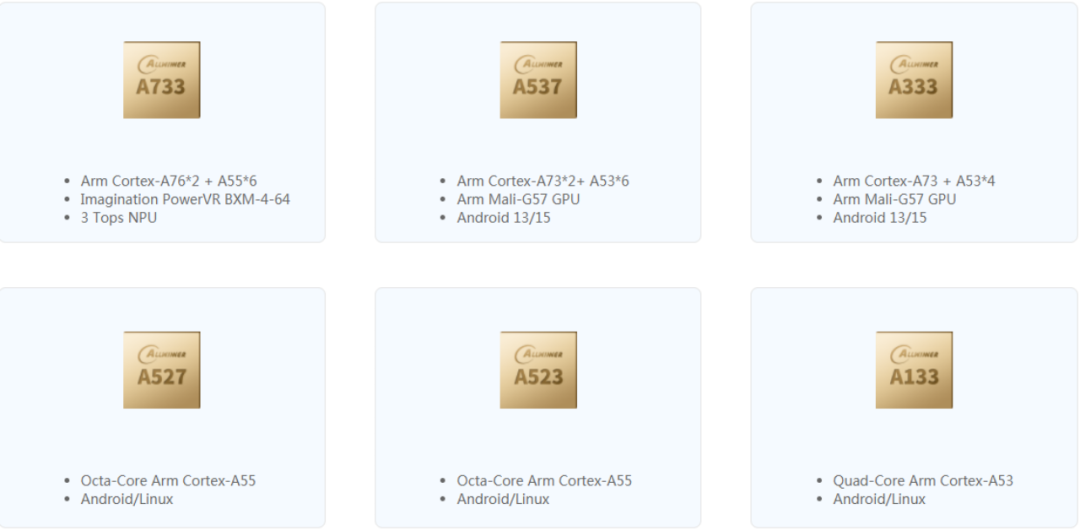 全志科技成立于2007年,是一家领先的智能应用处理器SoC、高性能模拟器件和无线互联芯片设计厂商。全志科技在超高清视频编解码、高性能CPU/GPU/NPU多核整合、先进工艺的高集成度、超低功耗、全栈集成平台等方面提供具有市场突出竞争力的系统解决方案和贴心服务,产品广泛适用于工业控制、智慧汽车、智慧家电、机器人、智慧安防、网络机顶盒、智能硬件、平板电脑、电源模拟器件、无线通信模组、智能物联网等多个产品领域。