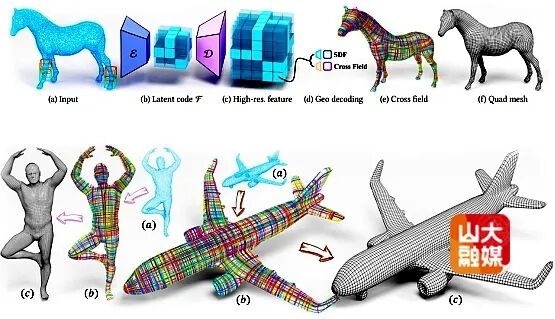 文章“CrossGen: Learning and Generating Cross Fields for Quad Meshing”提出了一种基于生成式AI的四边形网格划分方法,被录用为期刊论文(Journal Accept)。该方法利用自动编码器将输入的三维数据编码为稀疏体素网格,再解码生成符号距离场及其对应的cross field,从而在高效性与泛化性等指标上取得突破。本文第一作者为香港大学博士后董秋杰(山东大学IRC博士),共同第一作者为香港大学王杰鹏。指导教师包括美国德州农工大学教授王文平,山东大学教授屠长河、辛士庆等。