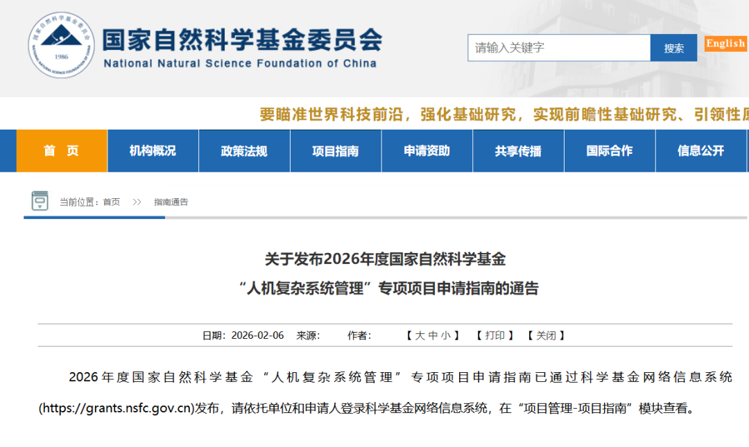 2026年度国家自然科学基金“人机复杂系统管理”专项项目申请指南已通过科学基金网络信息系统(https://grants.nsfc.gov.cn)发布,请依托单位和申请人登录科学基金网络信息系统,在“项目管理-项目指南”模块查看。文章来源:国家自然科学基金委员会官网