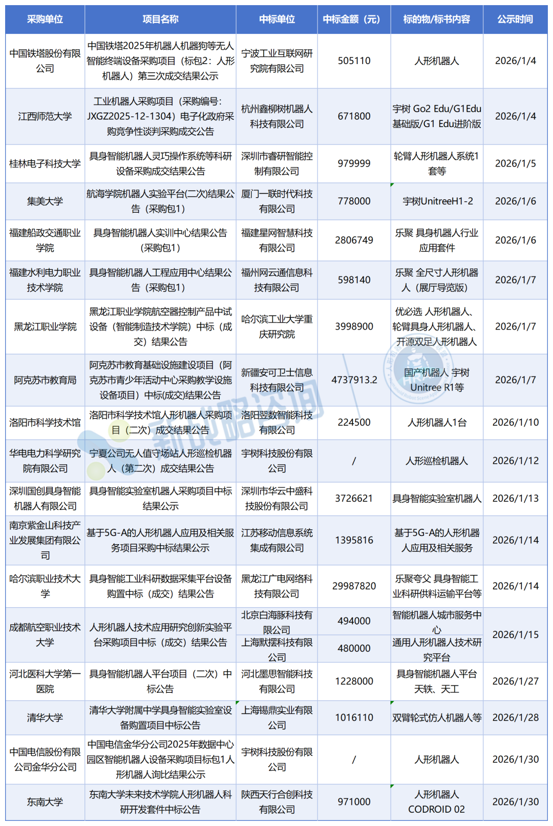2026年1月人形机器人相关中标项目(根据网络公开信息整理,如有未完善之处请指正)