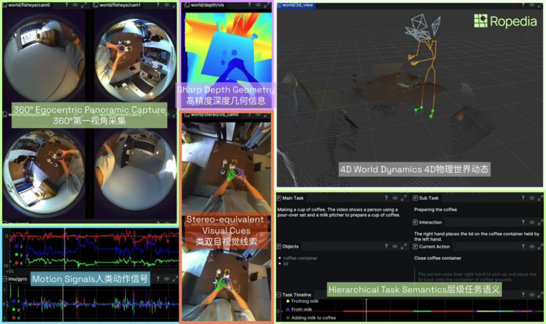 基于这一核心思路,Ropedia推出了头戴式便携采集系统HOMIE,这款产品已实现量产并开启批量交付。该系统以轻量化硬件为入口,可采集第一视角下人体运动、场景变化、物体交互等多模态信号,结合公司自研的4D重建与对齐算法,能精准恢复带有真实尺度信息的动态世界表示。相较于传统的视频数据,HOMIE采集的多模态数据可完整保留人与环境、人与物体的交互过程,更贴合机器人学习和评测的输入需求,其核心优势体现在高精度深度几何信息捕捉、360°第一视角全景采集、4D物理世界动态还原等多个维度。