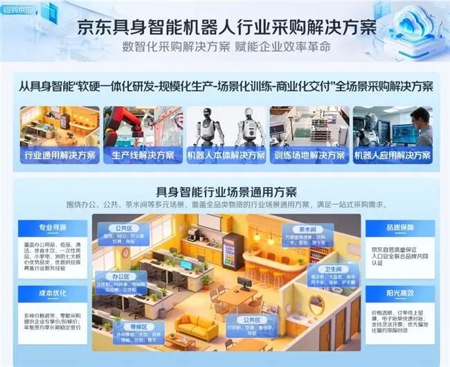 京东专门推出企业级“具身智能机器人”行业采购解决方案。该方案跳脱出单一的设备采购模式,围绕机器人产业的全价值链场景,构建了一套覆盖全品类的物资采购一站式服务体系:从研发端的通用元器件采购,到生产线的MRO物资配套;从机器人本体及核心零部件的供应,到训练场地的搭建、测试设备的部署,乃至后续应用场景的落地,京东均能提供行业通用的标准化方案与定制化的供应链支持。这不仅满足了企业从0到1的研发需求,更打通了从1到N的规模化生产堵点,真正为具身智能产业的爆发提供了坚实的物资底座。