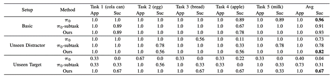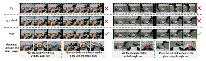 从定性执行效果来看,基线模型在面对未见物体时,频繁出现抓取姿态错误、目标误识别等问题,最终任务失败;而VISTA借助精准的视觉目标引导,可稳定完成抓取、放置全流程,充分验证视觉subgoal对执行精度的关键作用。