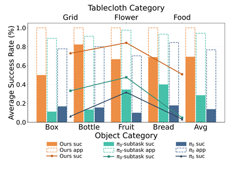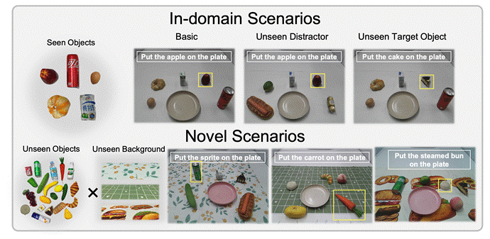实验训练数据仅使用鸡蛋、可乐罐、苹果、牛奶盒、牛角包5个物体,采集2小时真机遥操作数据,共737条轨迹;测试场景则覆盖21个完全未见物体、3种花纹桌布与全新场景布局,总计63个分布外场景。