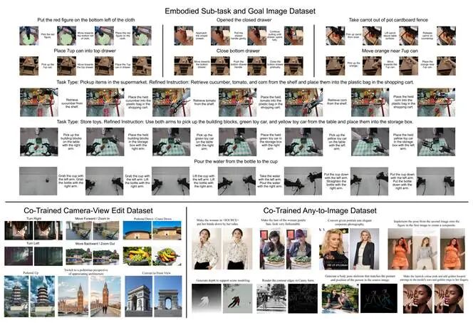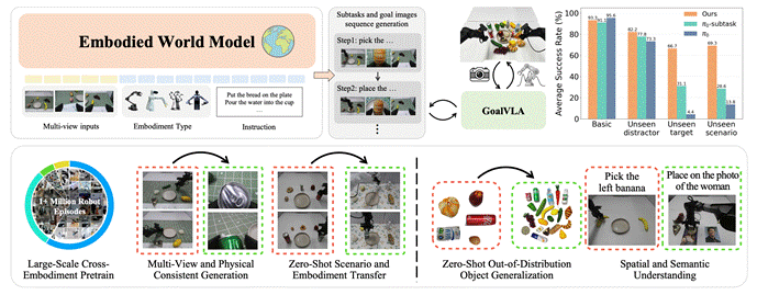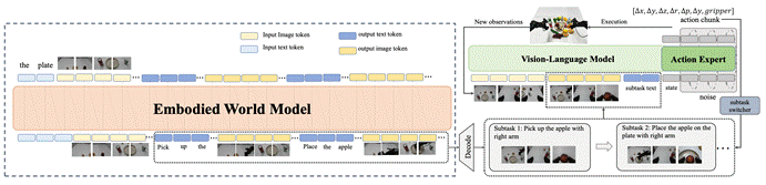作为整个系统的 “大脑” 与规划核心,具身世界模型负责将自然语言指令转化为机器人可理解、可执行的多步规划。它以初始观测图像和全局语言指令为输入,通过大规模预训练学到的物理规则、空间结构与操作常识,将长时序、复杂的操作任务自动拆解为一系列简单、有序、可完成的原子子任务。