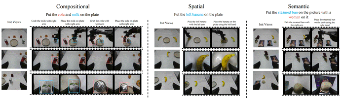 更值得关注的是,VISTA 能够轻松处理组合操作、空间理解、语义理解类复杂任务,而这正好弥补了传统VLA 模型在细粒度理解上的不足。在组合任务上,模型可以同时规划多个物体的操作序列,保持时序与空间逻辑一致;在空间理解上,模型能够精准响应 “左边的物体”“放在右侧盘子”“靠近芒果” 等方位指令;在语义理解上,模型可根据 “圆形盘子”、“方形盘子”、“放在人物照片上” 等抽象语义描述生成对应的视觉目标,完成更高难度的指令遵循。