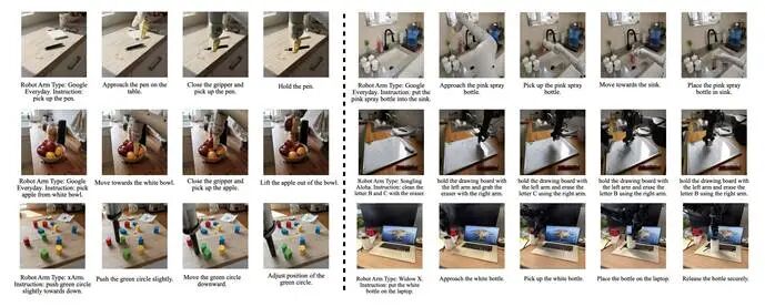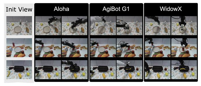 同时,VISTA 具备强大的跨具身迁移能力,无需针对不同机器人本体重新训练,同一模型即可为Agilex Aloha、AgiBot G1、WidowX等不同类型、不同结构的机器人平台,生成适配其本体结构的子任务序列与目标图像。这种跨具身迁移能力大幅降低了机器人策略适配成本,让一套规划模型可以在多机型上通用,是迈向通用机器人操作系统的关键特性。