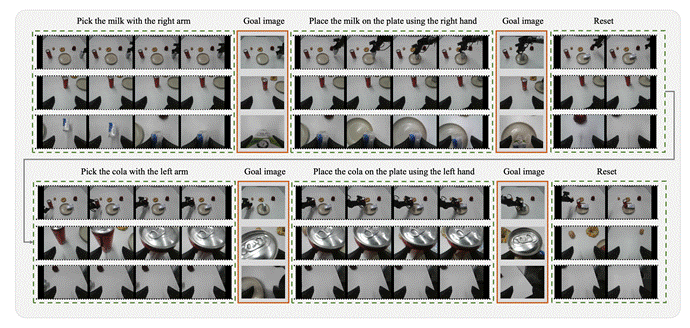 GoalVLA 是系统的“手”,负责将规划转化为真实动作。它不再像传统 VLA 那样仅依赖文本指令,而是以当前观测图像 + 文本子任务 + 视觉目标图像三者作为输入,联合推理出最优动作序列。这种多模态输入让机器人不仅知道 “要做什么”,更清楚 “该怎么做”以及“要做到什么样子”。